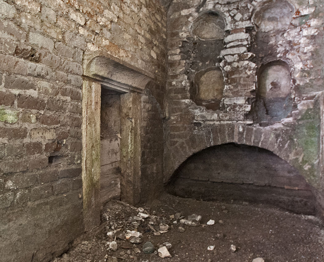 The other lateral wall has no arcosolia or niches, but only the low door with travertine jambs and lintel, leading to the lower burial chamber of tomb O.