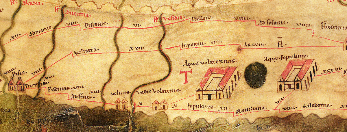 - 1:Tabula Peutingeriana: ancient Roman road map originally from the 4e/5e century AD