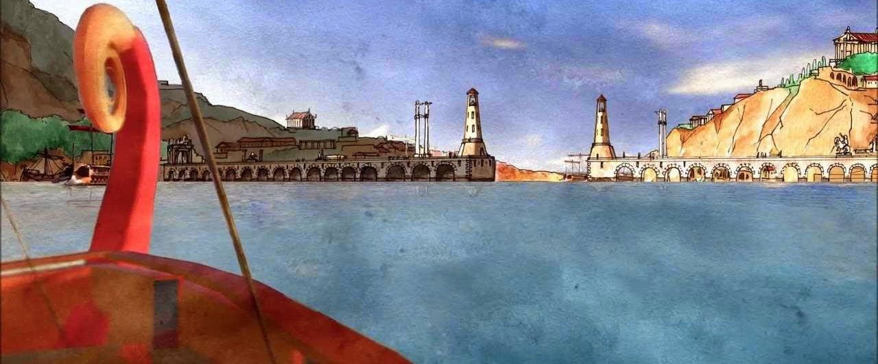 De haven van Alexandrië werd gedomineerd door het eiland Pharos dat met het vasteland was verbonden door een verbindingsweg, Heptastadium genoemd. Deze weg maakte van Pharos een schiereiland waardoor de baai werd verdeeld in een westelijk bassin, Eusnostos (oude haven), en een oostelijk bassin, Portus Magnus (grote haven). De twee bassins waren met elkaar verbonden door twee doorgangen in het Heptastadium die voorzien waren van een overbrugging8.