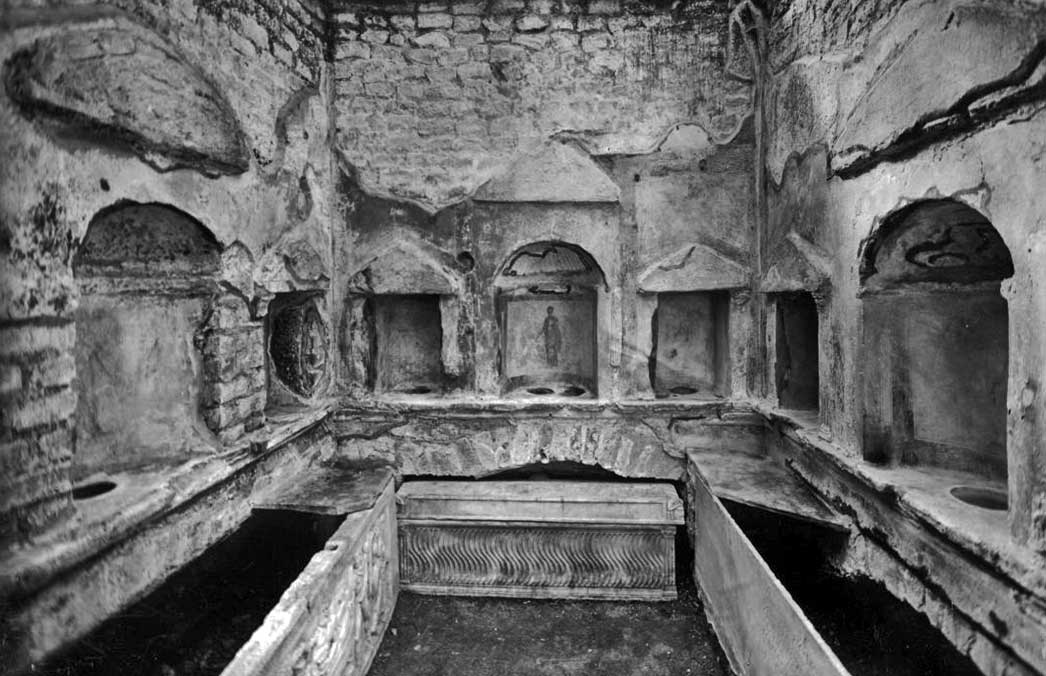 In the centre of the back and side walls are semicircular niches for urns, flanked by smaller rectangular niches. The central niches had a yellow background framed by a blue band. In each niche was a depiction of one of the three Parcae, the Fates (now to the museum). In the backwall we see Lachesis, wearing a red mantle and holding scales in her right hand. On the right wall Atropos, wearing a blue mantle, holding an unrolled scroll with both hands. Clotho was depicted in a blue dress on the left wall. She held a distaff and spindle. On either side of these niches are rectangular niches, flanked by fluted columns, with floral motifs.