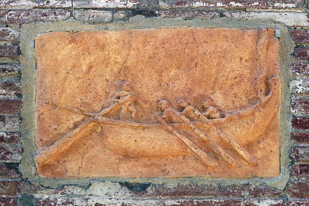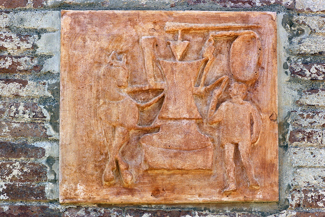 Next to the inscription are two terracotta reliefs. On the right one we see a boat with oars and a man at the stern with a helm. The oars are operated by three sitting oarsmen. On the left relief we see a horse turning a grain mill. The horse is managed by a serv