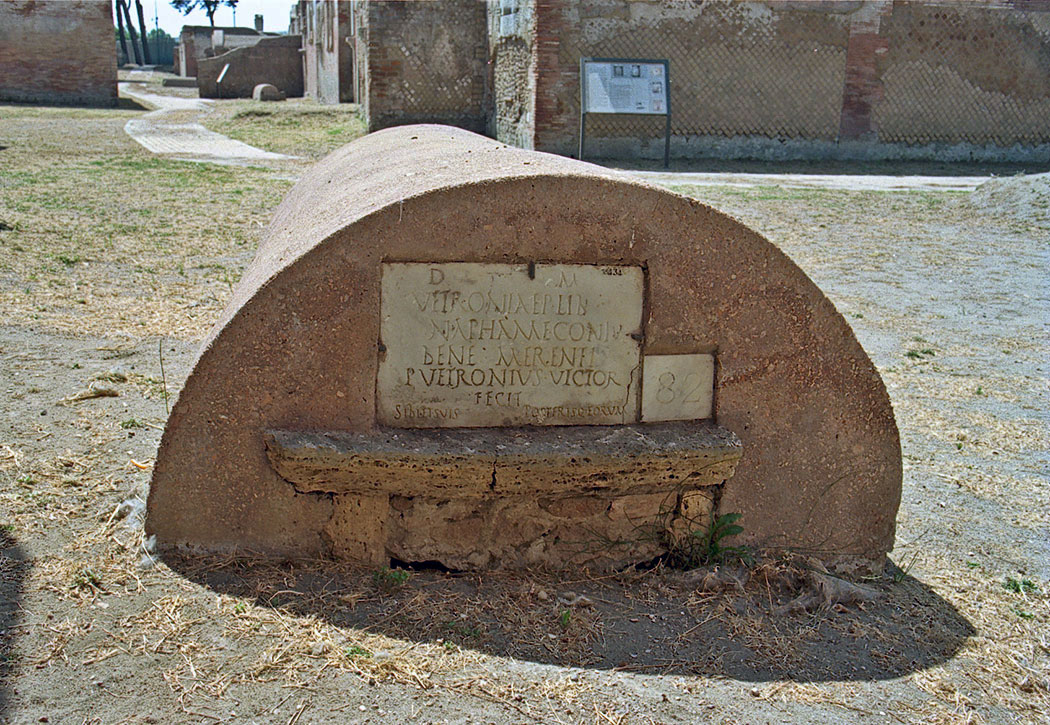 The tomb was built by Publius Vetronius Victor for Vetronia Naphame, freedwoman of Publius, his very devoted wife, for himself, his family, and the heirs.
