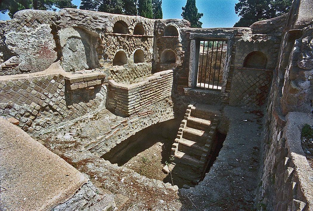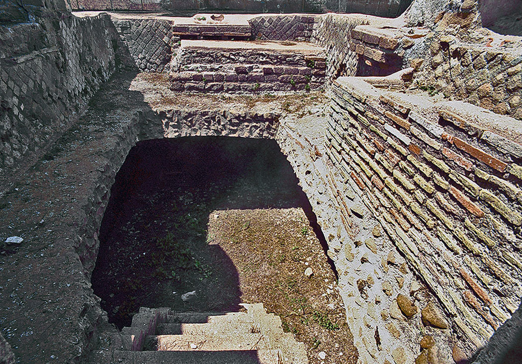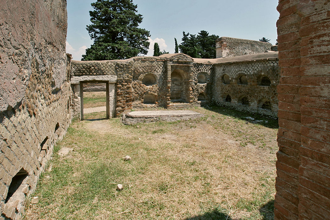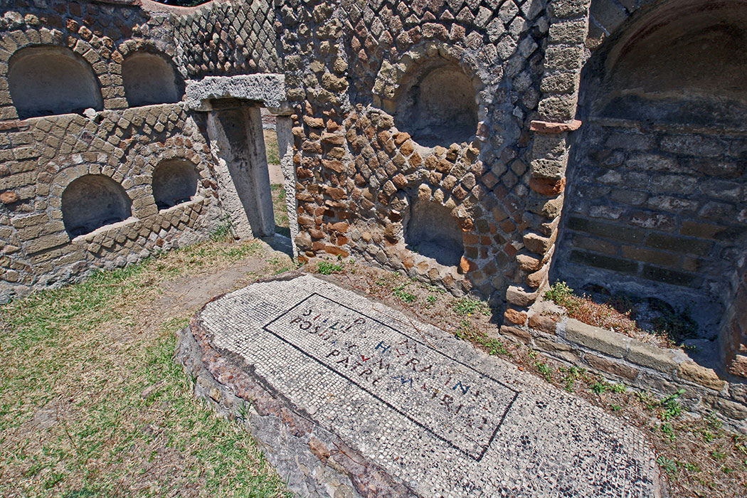 The upper burial chamber has been built for interring urns only and has large central niches flanked by small, semicircular niches. The floor, now disappeared, must have been covered by a black-and-white mosaic.