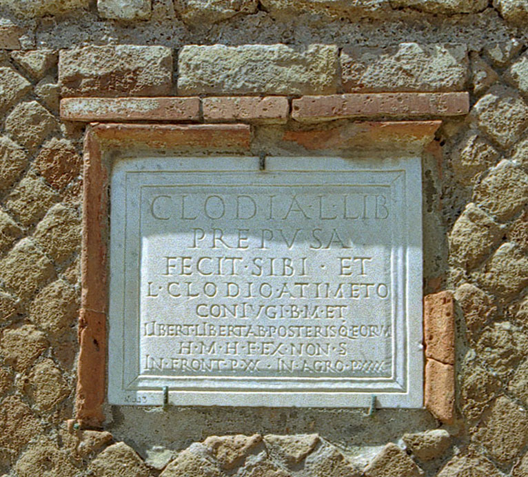 Clodia Prepusa, freedwoman of Lucius, has built this monument for herself and for Lucius Clodius Atimetus, her well-deserving husband, and for her freed slaves, and the descendants. The tomb could not be inheritated by those who did not belong to the family. The area measures 20 feet in width and 40 feet in depth.